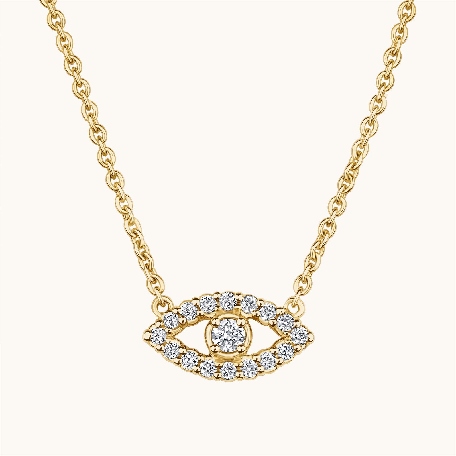 A dainty diamond evil eye necklace symbolizing protection and luck, crafted in solid 14K gold and made for everyday wear.