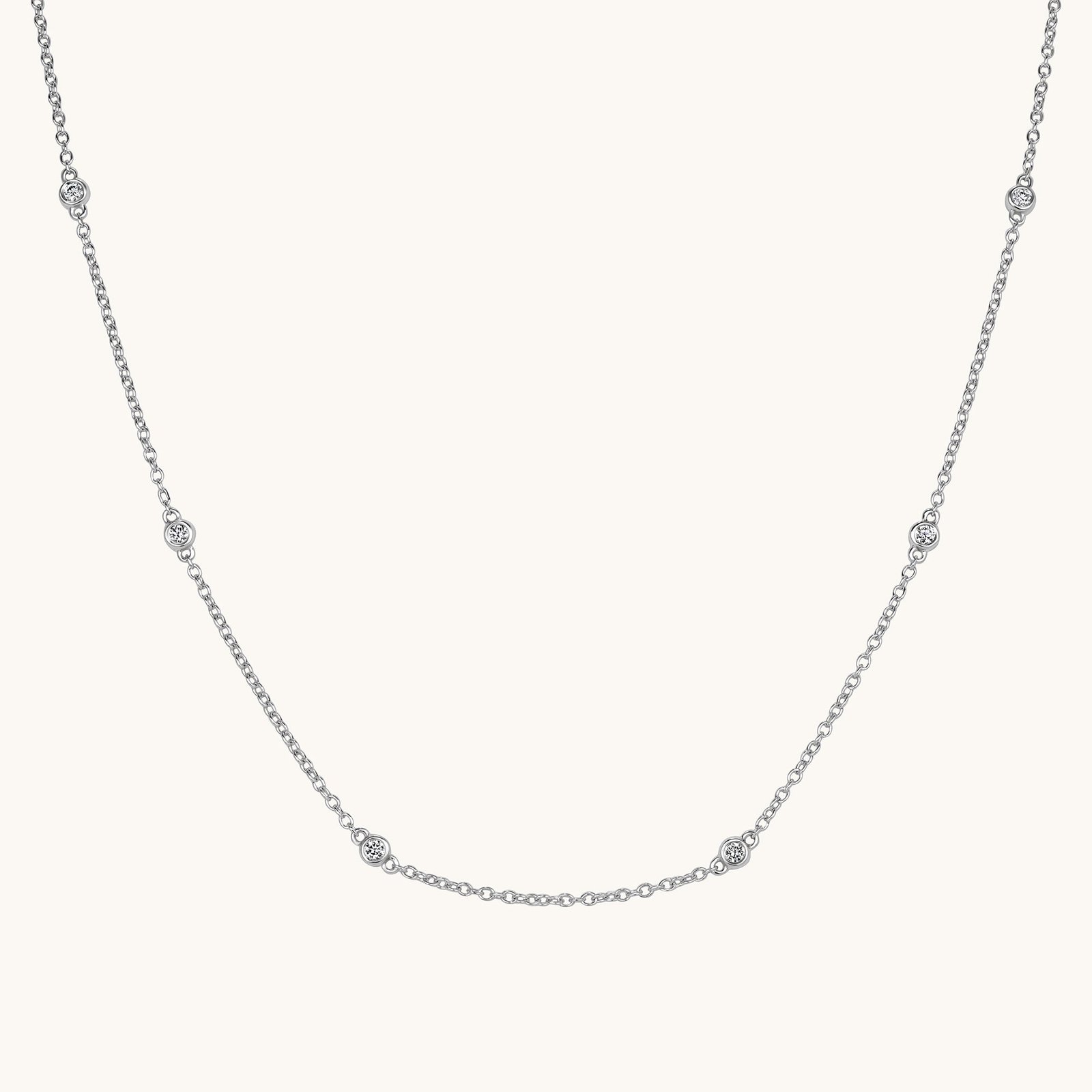 Effortlessly refined, this necklace features natural round diamonds set in minimalist bezel stations, spaced evenly along a delicate gold chain. Inspired by the classic “Diamonds by the Yard” design, each stone appears to float, catching the light with every movement. Whether layered or worn solo, it’s a timeless piece with just the right amount of sparkle.